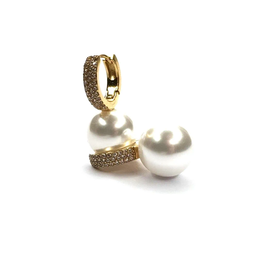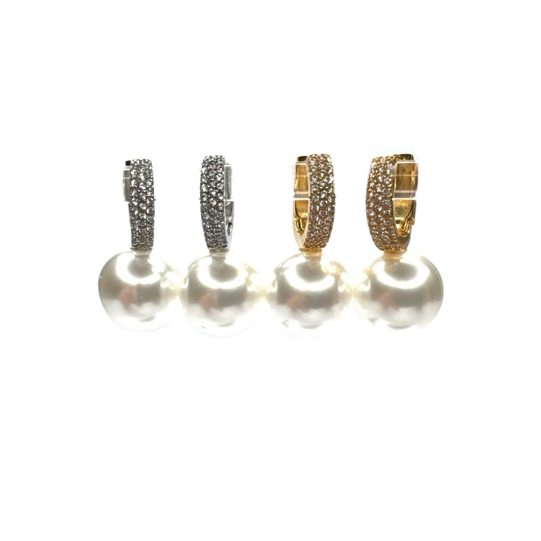 Orecchini perla della collezione Perlage, realizzate con perla su base cerchietto strass oro o argento.