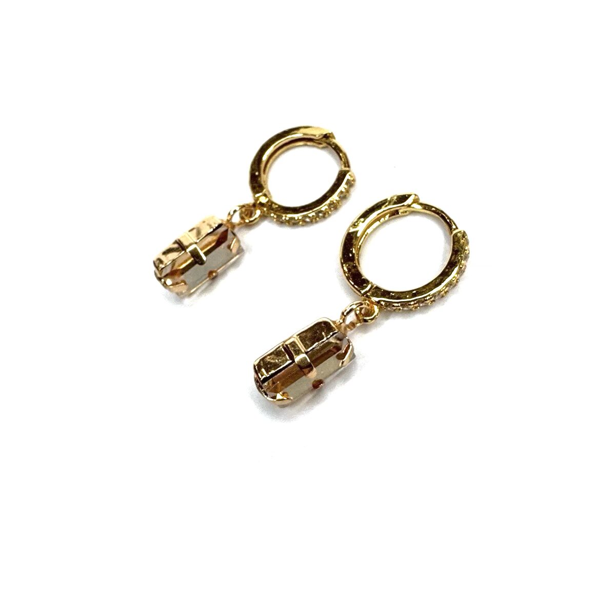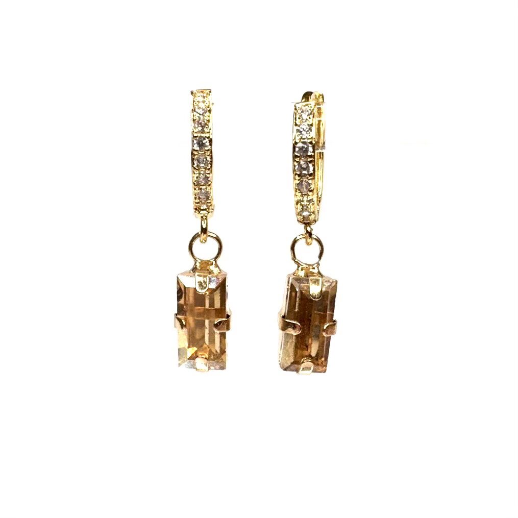 Orecchini pietra gialla oro con montatura a mini cerchietto con strass oro e charm pietra rettangolare champagne.