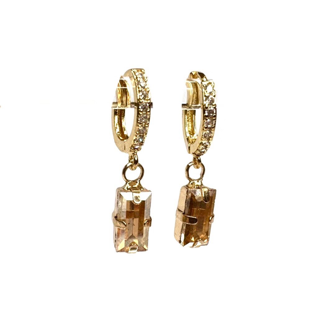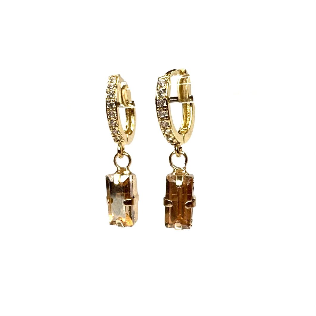 Orecchini pietra gialla oro con montatura a mini cerchietto con strass oro e charm pietra rettangolare champagne.