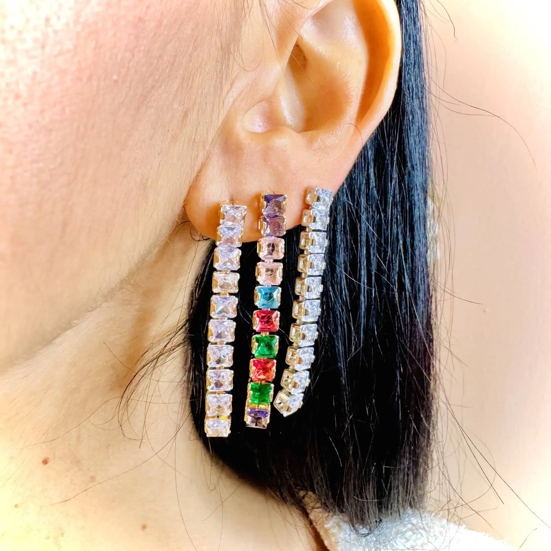 Orecchini tennis lunghi con montatura a lobo, disponibili in 3 colori diversi.