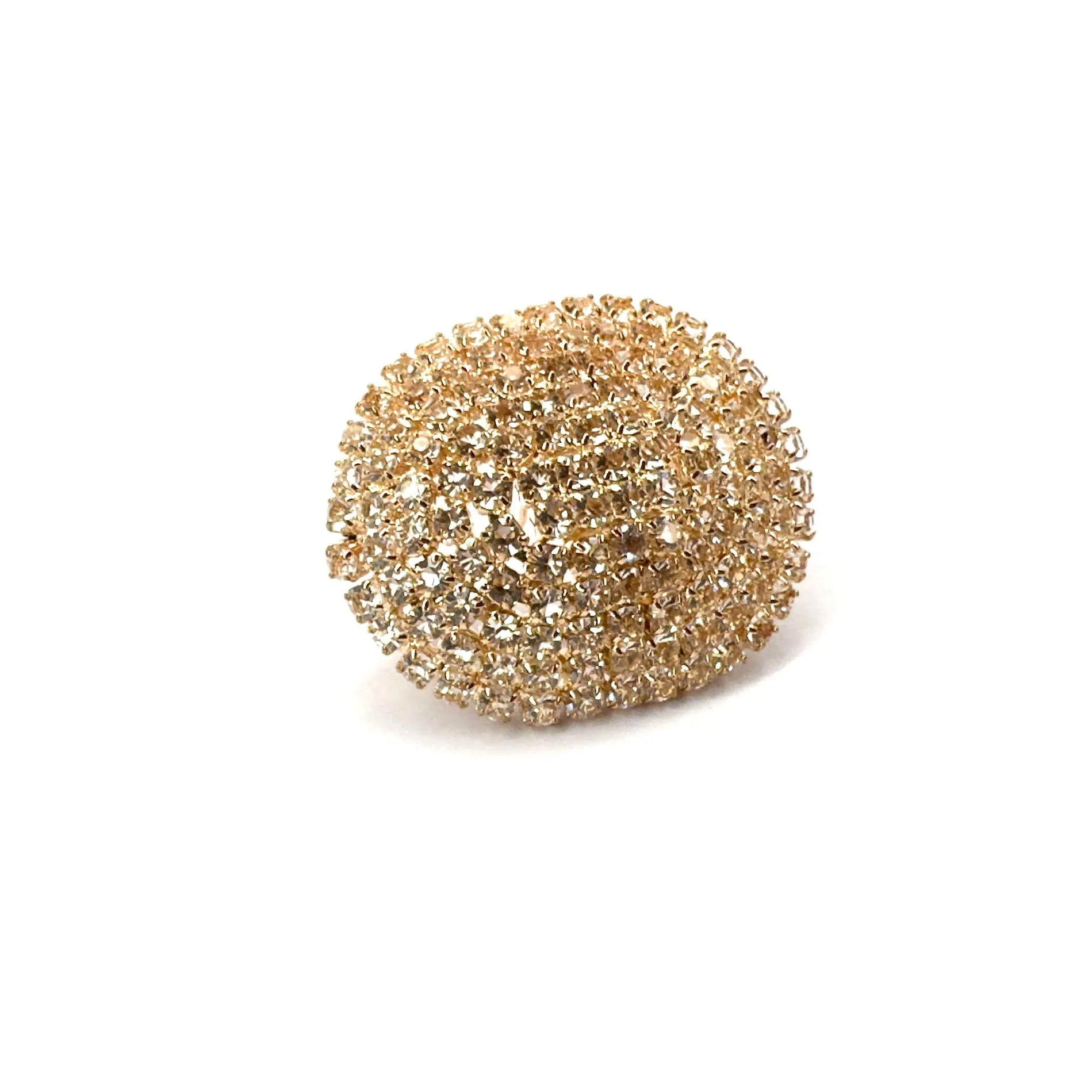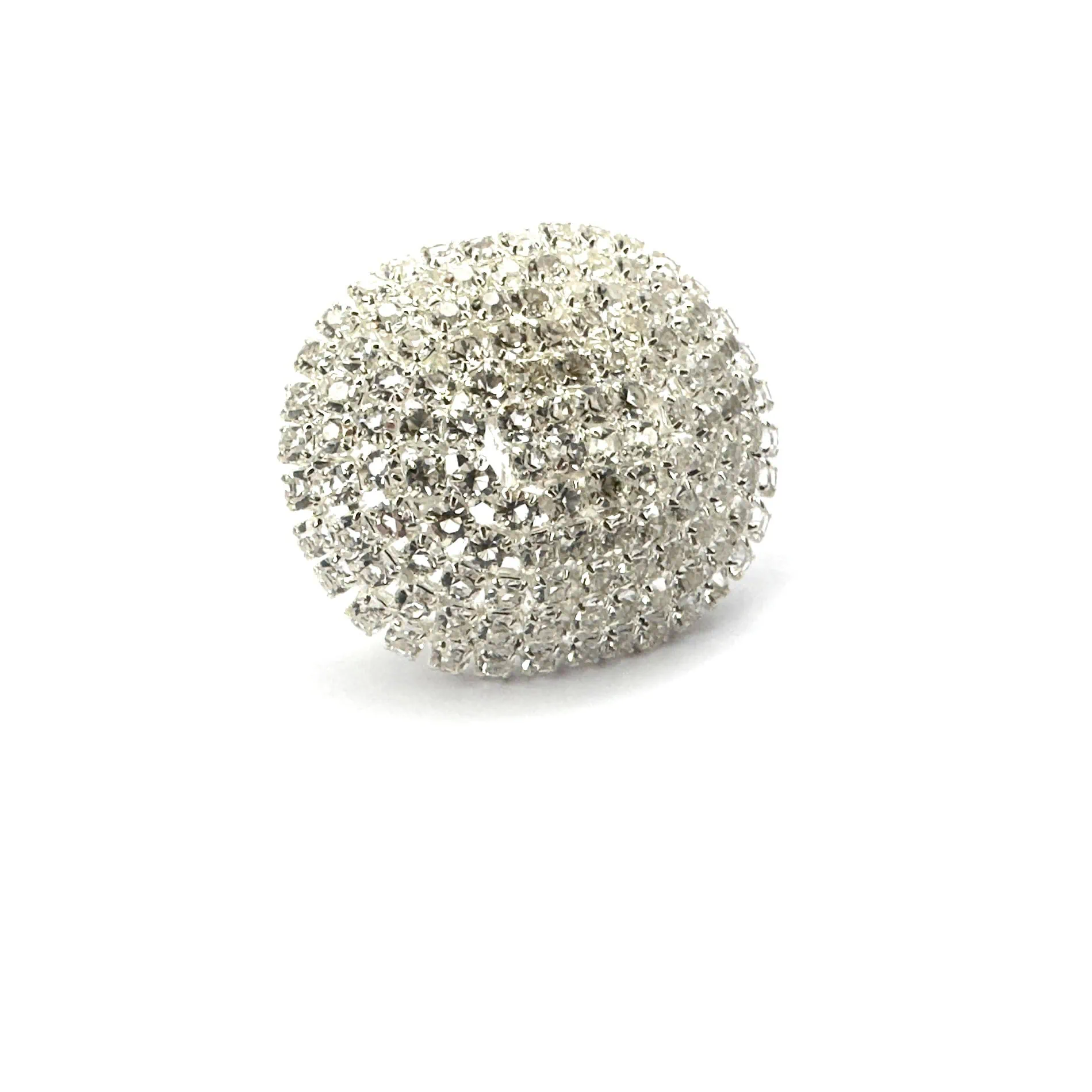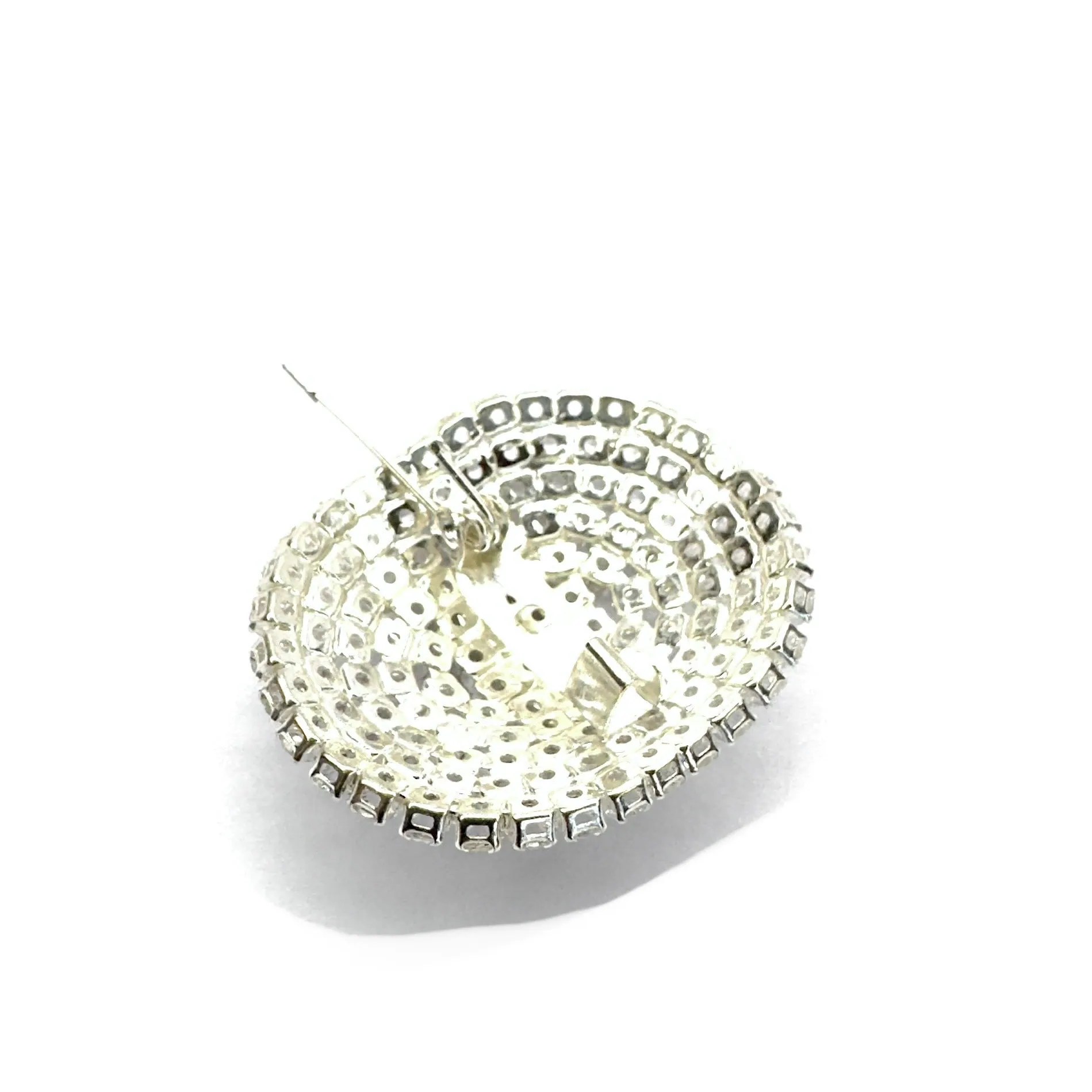 Spilla con strass realizzata con strass su base bombata metallica di forma ovale.