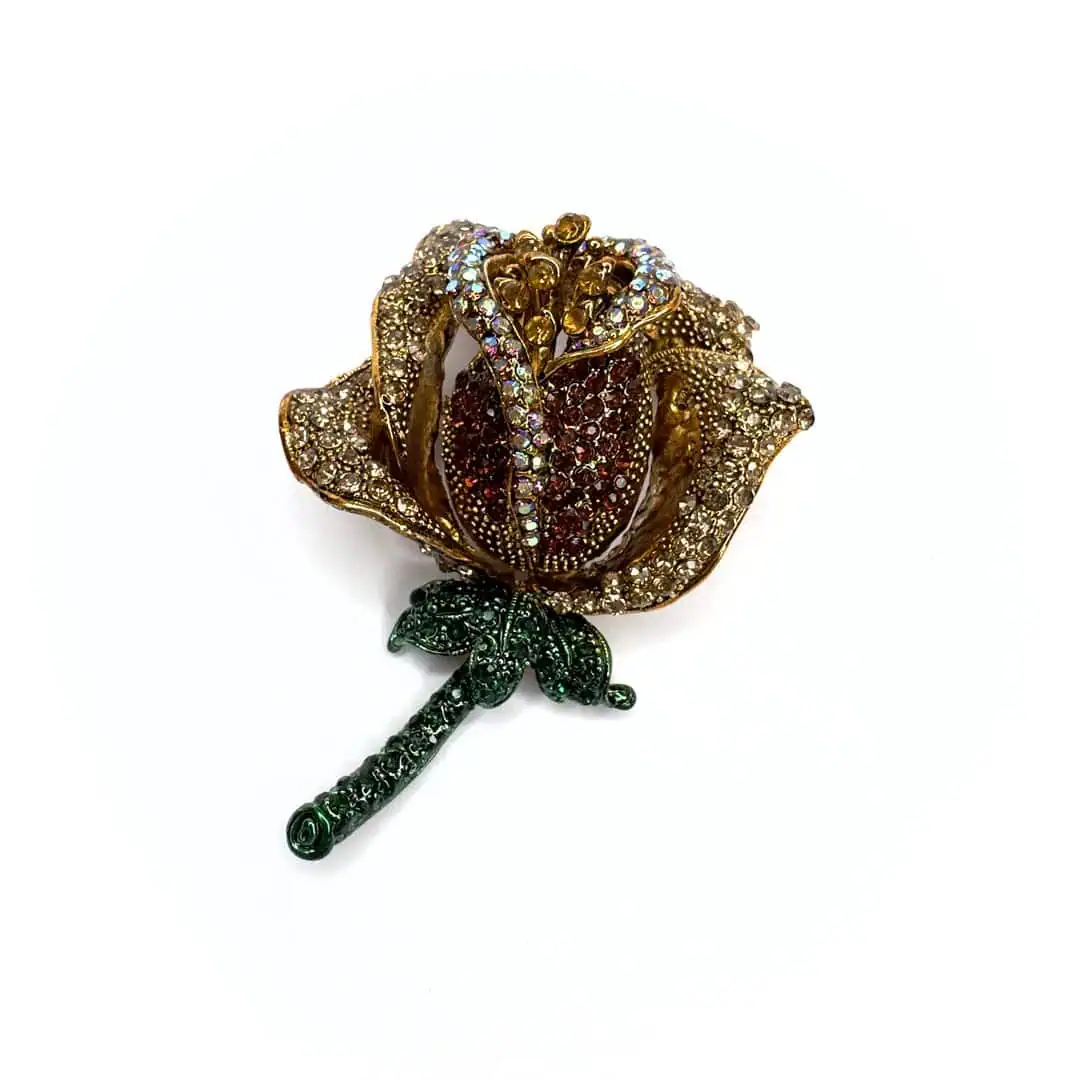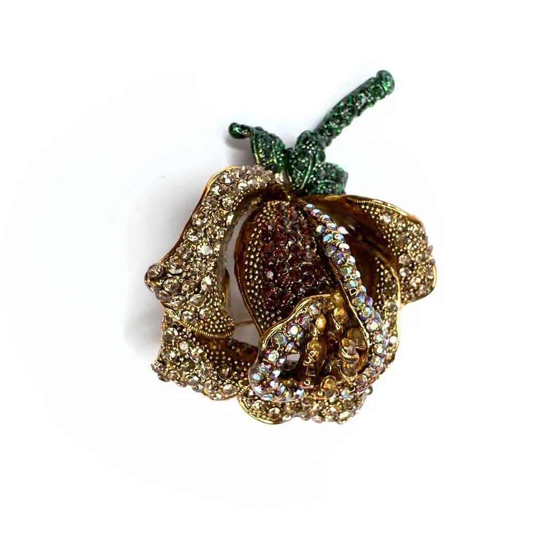 Spilla fiore rosa 3d tempestata di strass in vari colori.