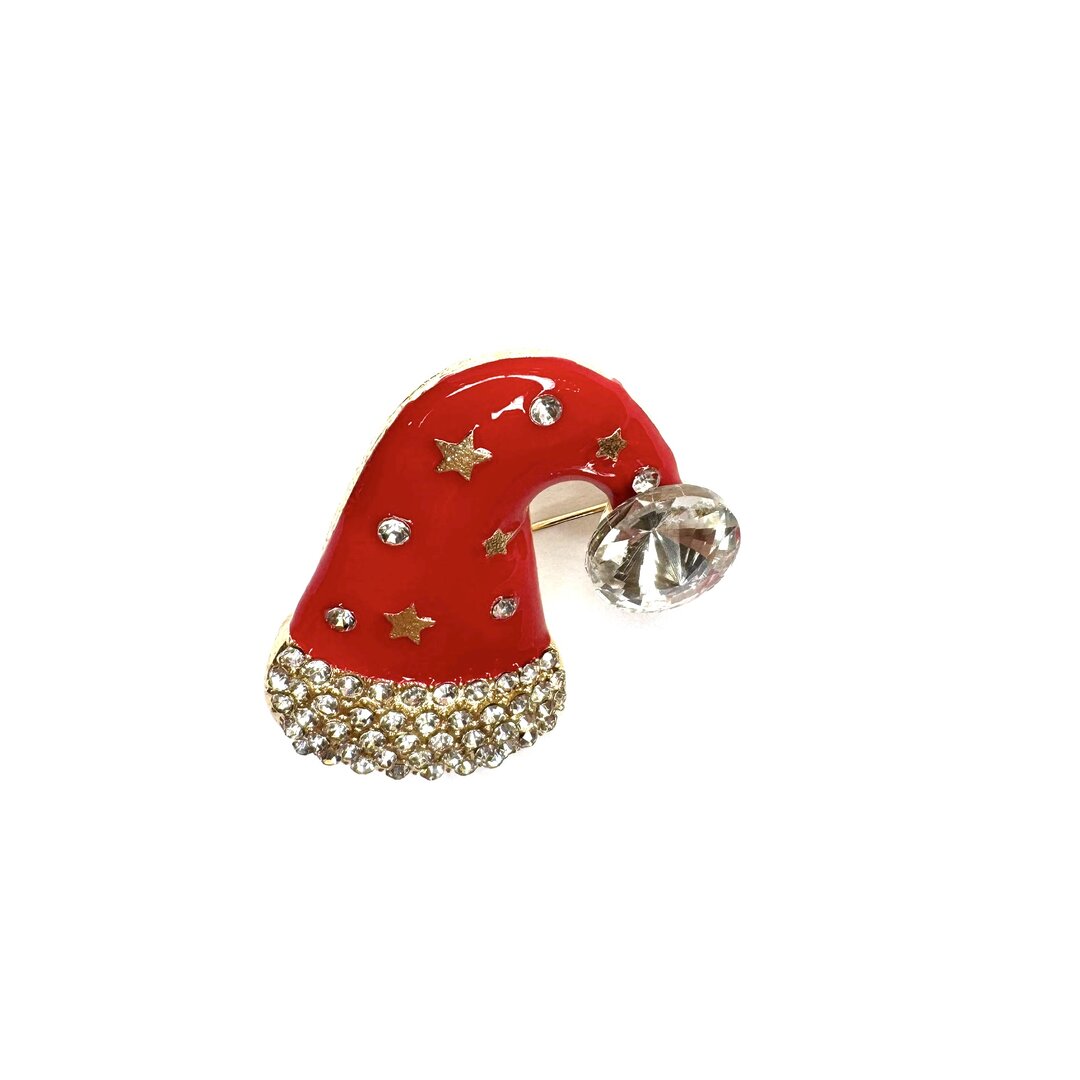 Spilla natalizia smaltata con pietra in vetro cristallo a forma di cappello di Babbo Natale per essere brillante sotto le feste.