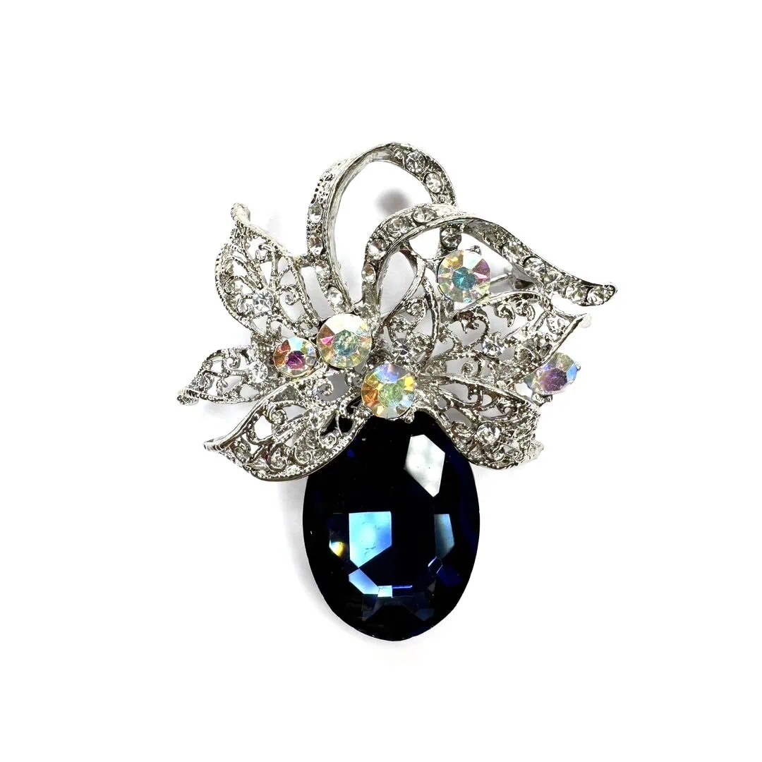 Spilla vintage e realizzata con pietra ovale, e montatura barocca in vari colori.