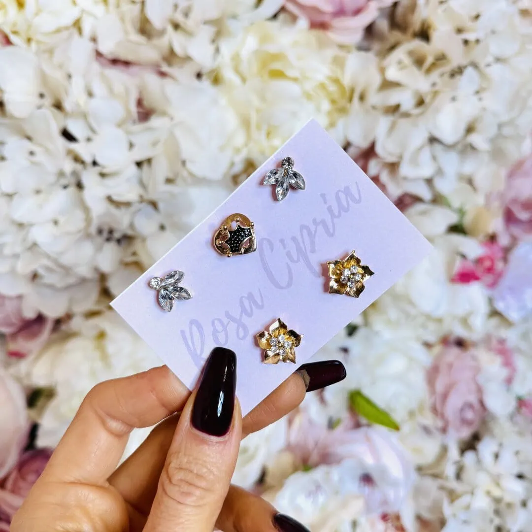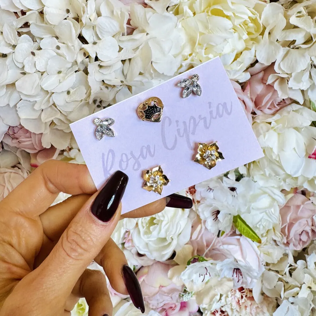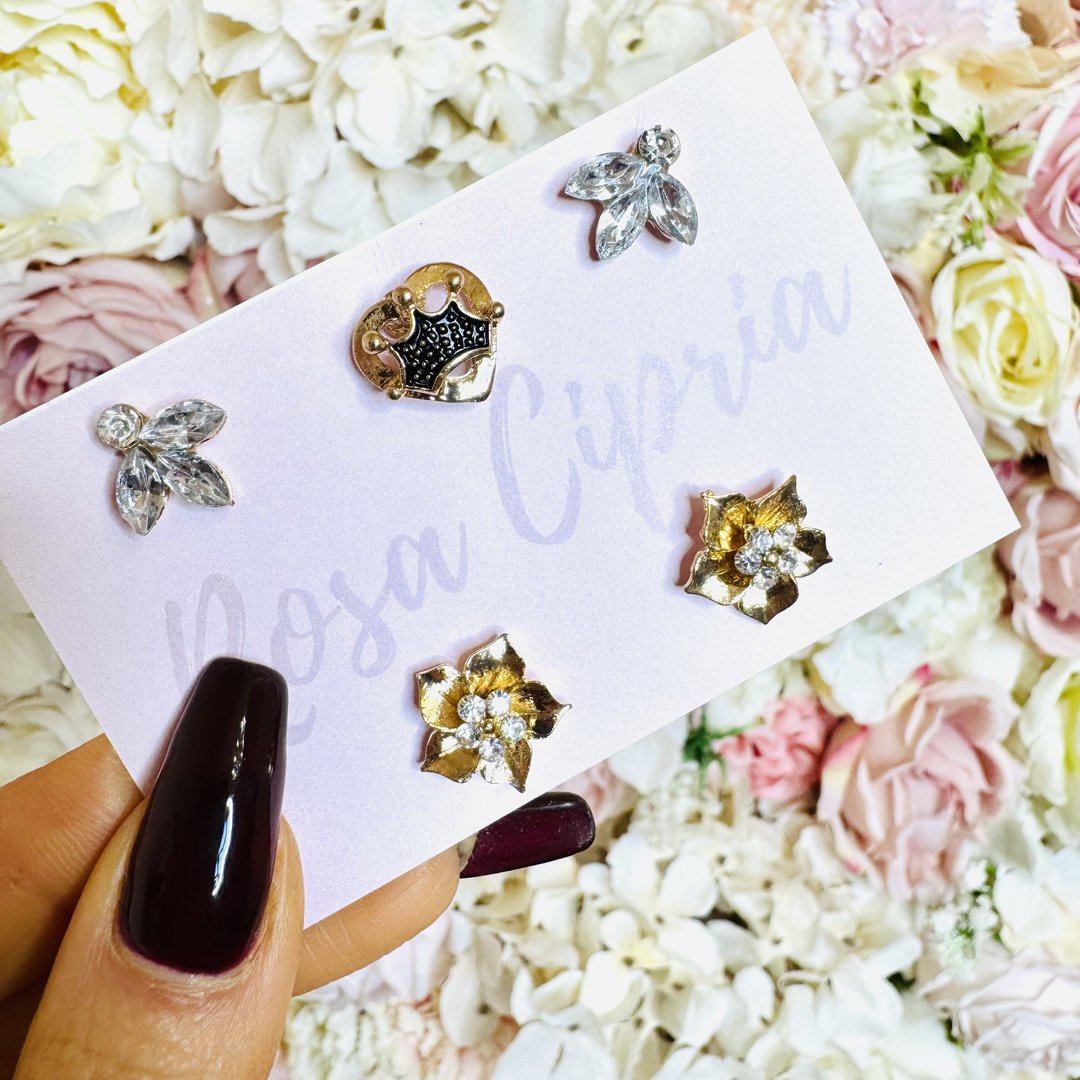 Il set è costituito in totale da 5 spille pin: 2 con pietre, 2 con fiore ed una con corona su cuore.